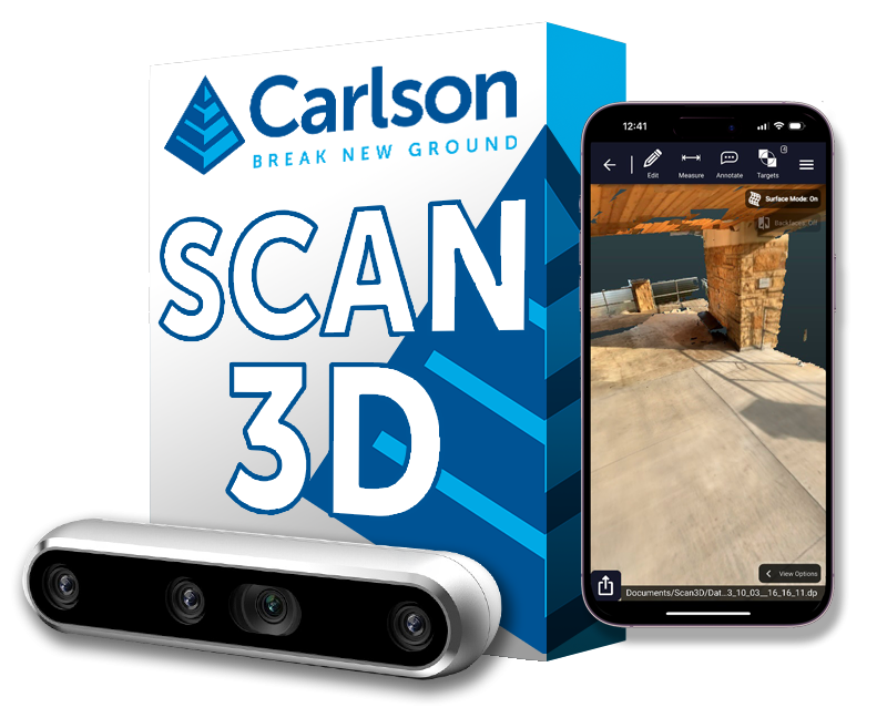 A Scan3D LiDAR-ral felszerelt iOS-eszközzel vagy Carlson RT5 vagy RTk5 táblagéppel működik, amelyhez D455 RealSense kamera tartozik, amely lenyűgöző hatótávolságot és globális redőnyt biztosít a jobb szín- és mélységinformációk érdekében.